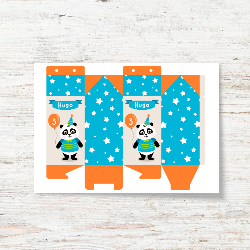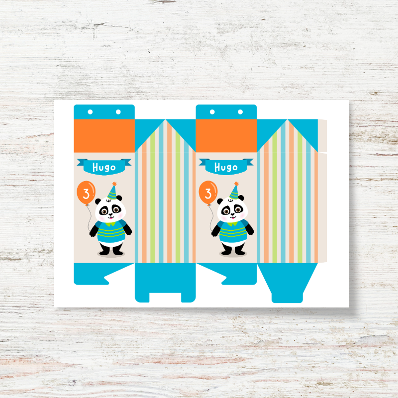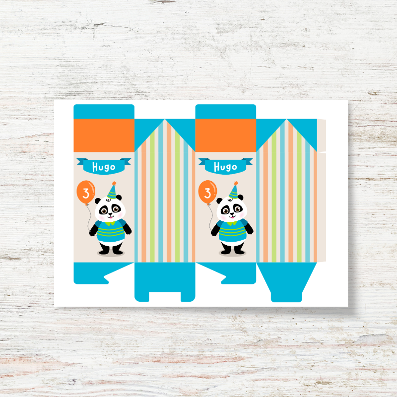 Surpreende os convidados com a Caixa de Lembranças Panda – um ficheiro digital A4 personalizado, perfeito para imprimir e completar a decoração da festa.