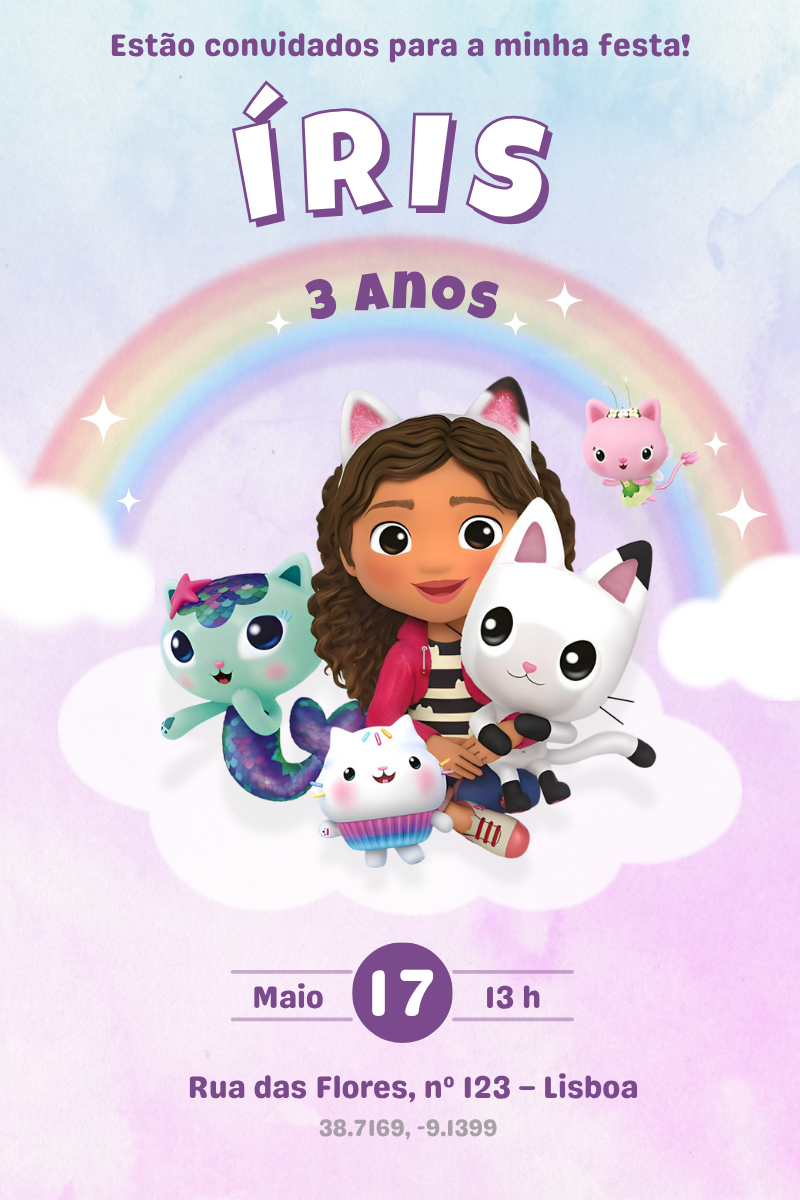 Surpreende os convidados com um convite digital mágico e personalizado com o tema Casa de Bonecas da Gabby!