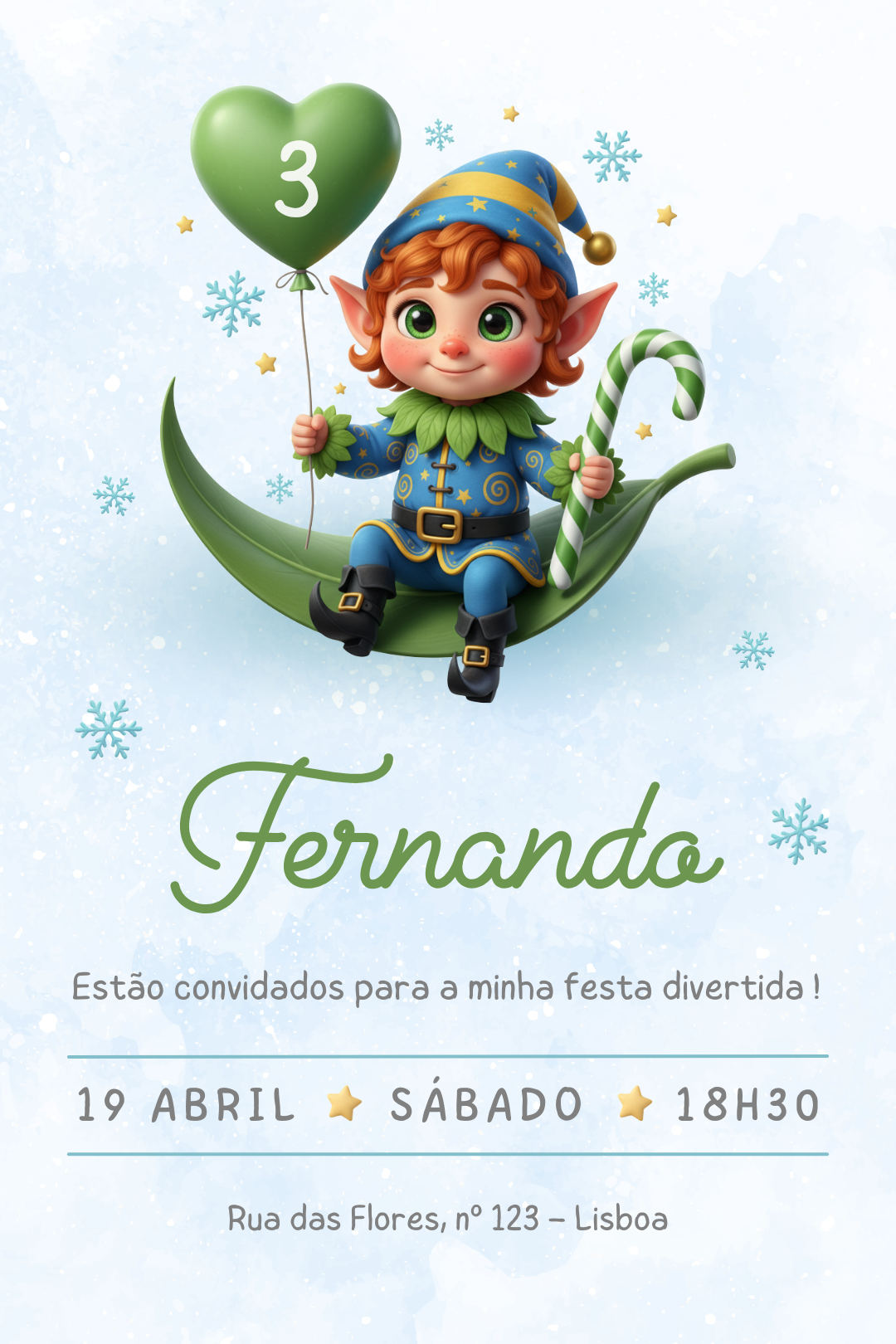Surpreende os convidados com um convite digital mágico e personalizado com o tema Elfo!