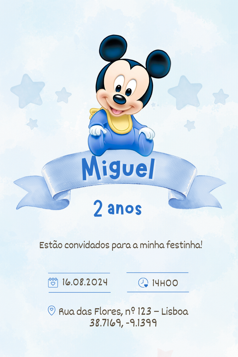 Surpreende os convidados com um convite digital mágico e personalizado com o tema Mickey Bebé!