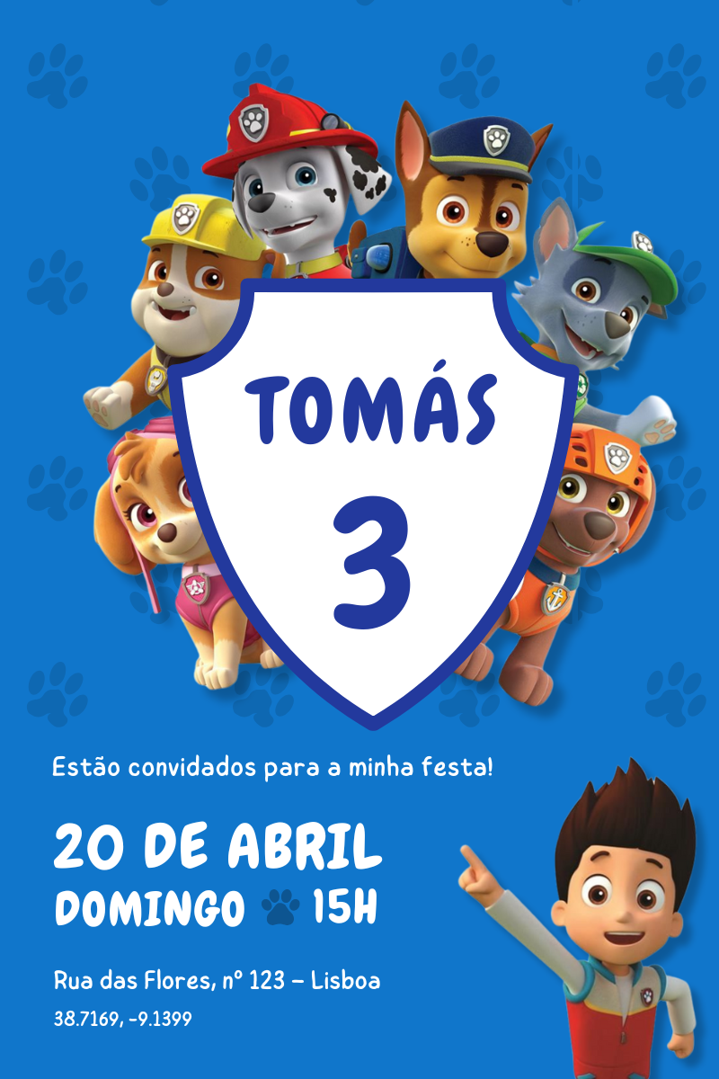 Surpreende os convidados com um convite digital mágico e personalizado com o tema Patrulha Pata!