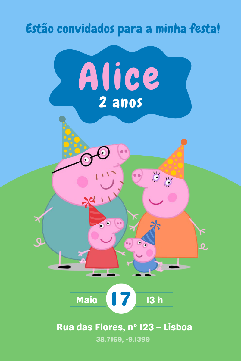 Surpreende os convidados com um convite digital mágico e personalizado com o tema Peppa Pig!