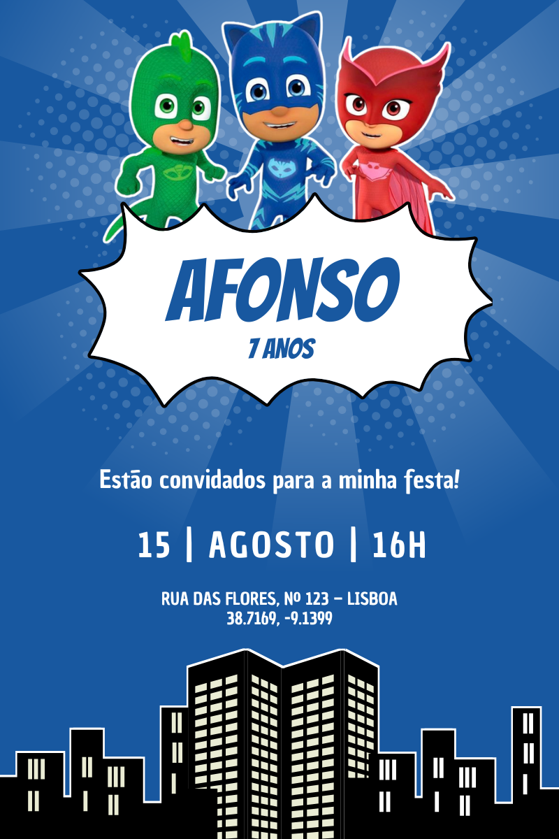Surpreende os convidados com um convite digital mágico e personalizado com o tema PJ Masks!