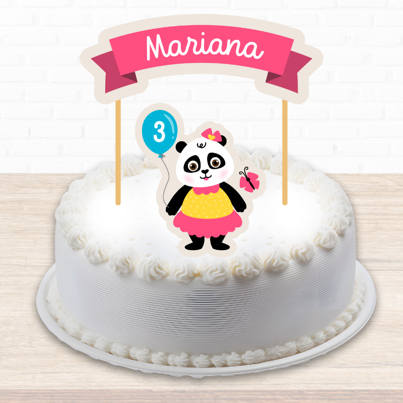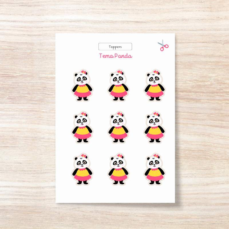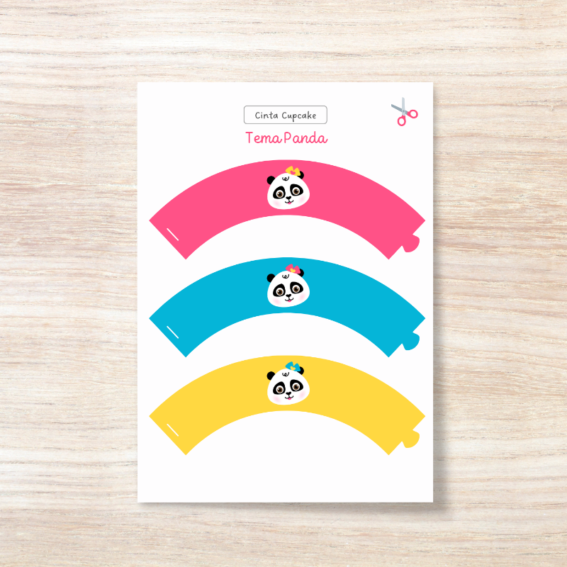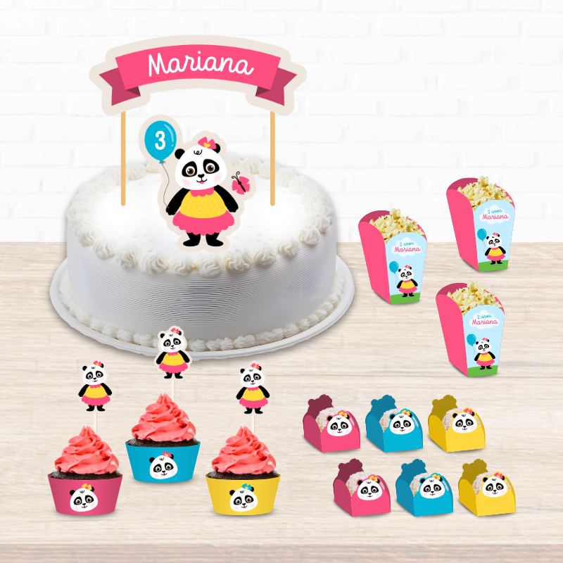 O Kit Mesa Panda digital inclui topo de bolo, caixa de pipocas, formas de papel, cintas e toppers para cupcakes.